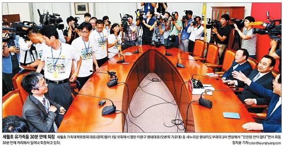 한겨레는 회동 시작 30여분 만에 가족대책위 대표들이 퇴장하는 장면을 1면 사진으로 내보내며 “이완구 원내대표 등 새누리당 지도부와 ‘세월호 참사 희생자·실종자·생존자 가족대책위원회’ 대표들이 1일 오후 국회에서 세월호 특별법 쟁점을 논의하기 위해 3차 회동을 했지만 새누리당의 완강한 태도에 가족대책위가 항의하며 퇴장했다”고 전했다.