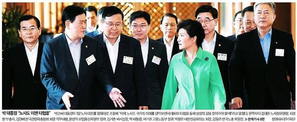 중앙일보는 ‘박 대통령 “노사도 이젠 타협을”’이라는 제목의 사진을 통해 “박 대통령이 노사 대표를 청와대로 초청해 ‘이제 노사도 국가의 미래를 생각하면서 대화와 타협을 통해 상생의 길을 찾아가야 할 때’라고 말했다”고 전했다.