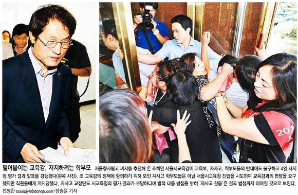 동아일보는 ‘밀어붙이는 교육감, 저지하려는 학부모’라는 제목의 사진을 통해 조 교육감이 4일 서울시교육청 기자실에서 재지정 평가 결과를 발표하는 모습과 이날 항의하기 위해 모인 자사고 학부모들이 서울시교육청 진입을 시도하다 직원들에게 저지당하는 모습을 전했다. 동아일보는 “조 교육감은 교육부, 자사고, 학부모들의 반대에도 불구하고 재지정 평가 결과 발표를 강행했다”면서 “자사고 학부모를 비롯해 자사고 교장단도 시교육청의 평가 결과가 부당하다며 법적 대응 방침을 밝혀 ‘자사고 갈등’은 결국 법정까지 이어질 것으로 보인다”고 보도했다.