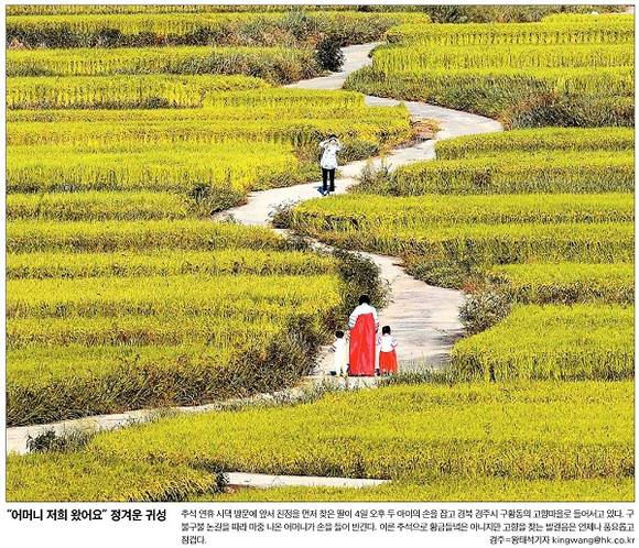 한국일보는 ‘“어머니 저희 왔어요” 정겨운 귀성’이란 제목의 사진을 통해 두 아이의 손을 잡은 딸이 논길을 걸어 어머니에게로 향하는 모습을 전했다. 한국일보는 “추석연휴 시댁 방문에 앞서 친정을 먼저 찾은 딸이 경북 경주시 구황동의 고향마을로 들어서고, 구불구불 논길을 따라 마중 나온 어머니가 손을 들어 반긴다”며 “이른 추석으로 황금들녘은 아니지만 고향을 찾는 발걸음 언제나 풍요롭고 정겹다”고 보도했다.