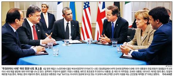조선일보는 프랑수아 올랑드 프랑스 대통령, 페트로 포로센코 우크라이나 대통령, 존 케리 미 국무장관, 오바마 대통령, 데이비드 캐머런 영국 총리, 앙겔라 메르켈 독일 총리, 마테오 렌치 이탈리아 총리가 테이블에 앉아 논의하고 있는 모습을 1면 사진으로 내걸며 “이날 포로센코 대통령은 NATO가 러시아의 침공에 맞서고 있는 우크라이나에 강력한 군사적 지원을 하는 선언문을 채택할 것이라고 밝혔다”고 전했다.