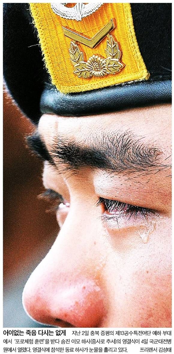 중앙일보는 “지난 2일 충북 증평의 제13공수특전여단 예하 부대에서 포로체험 훈련을 받다 숨진 이모 하사(중사로 추서)의 영결식이 4일 국군대전병원에서 열렸다”며 영결식에 참석한 동료 하사가 눈물을 흘리는 모습을 1면 사진으로 보도했다.