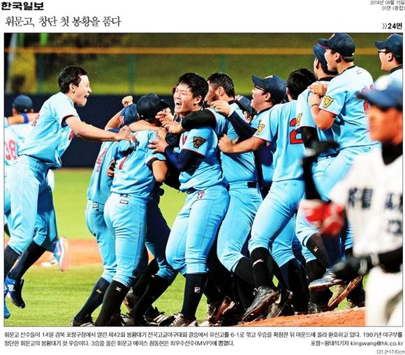 한국일보는 ‘휘문고, 창단 첫 봉황을 품다’란 제목의 1면 사진으로 제42회 봉황대기 전국고교야구대회 결승에서 휘문고의 첫 우승을 알렸다. 한국일보는 “휘문고 선수들이 14일 경북 포항구장에서 유신고를 6-1로 꺾고 우승을 확정한 뒤 마운드에 올라 환호하고 있다”며 “1907년 야구부를 창단한 휘문고의 봉황대기 첫 우승”이라고 밝혔다. 경향신문은 남북통일을 염원하며 통일로를 지나 임진각까지 달리는 제44회 대통령기 전국통일구간마라톤대회 출발 모습을 담고 배문고ㆍ서울체고 연합팀인 서울이 1위로 골인해 사상 첫 4연패를 달성했다고 전했다.
