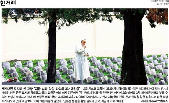 한겨레는 세계대전 묘지에 선 프란치스코 교황의 모습을 실었다. 한겨레는 “교황이 13일(현지시각) 이탈리아 북부 레디풀리아에 있는 1차 세계대전 참전 군인 묘지에 참배하고 있다”며 “교황은 이날 미사 강론에서 ‘두 번의 세계대전을 겪었지만, 심지어 오늘날에도 3차 세계대전이라고 부를 수 있는 전쟁이 벌어지고 있다. 이 전쟁은 범죄ㆍ학살ㆍ파괴와의 싸움’이라며 ‘인류는 눈물을 흘릴 필요가 있고, 지금이 바로 그때다’라고 말했다”고 밝혔다.