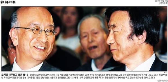 조선일보와 중앙일보는 냉랭한 분위기의 한일관계가 이어지는 가운데 윤병세 외교부 장관(사진 오른쪽)과 벳쇼 고로 주한 일본 대사의 첫 만남을 보도했다. 조선일보는 ‘모처럼 마주보고 웃은 韓ㆍ日’이란 제목의 1면사진에서 14일 서울 강남구 코엑스에서 열린 ‘2014 한ㆍ일 축제 한마당’ 행사에서 두 관료가 만나 이야기하는 사진을 실었다. 조선일보는 “현 정부 출범 후 외교부 장관이 주한 일본 대사를 일대일로 만난 것은 처음”이라며 “윤 장관은 고로 대사에게 ‘양국 간 문화 교류 등을 확대해 좋은 분위기 속에서 내년 국교 정상화 50주년을 맞자’고 했다”고 밝혔다. 중앙일보도 ‘윤병세ㆍ벳쇼 18개월 만에 첫 만남’의 제목으로 “지난해 3월 취임한 윤 장관이 일본대사를 별도로 만난 건 처음이다. 이 행사는 2005년 한ㆍ일 국교 정상화 40주년을 기념해 시작됐다”고 밝혔다.