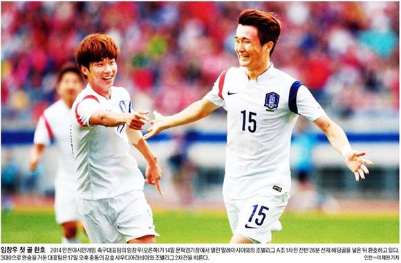세계일보는 아시안게임 한국축구가 말레이시아를 3대0으로 대파했다며 “2014 인천아시안게임 축구대표팀의 임창우(사진 오른쪽)가 14일 문학경기장에서 열린 말레이시아와의 조별리그 A조 1차전 전반 26분 선제 헤딩골을 넣은 뒤 환호하고 있다”고 보도했다. 서울신문도 임창우 선수가 선제골을 넣은 뒤 동료들고 함께 기쁨을 나누고 있는 모습을 싣고 “한국은 이어진 김신욱, 김승대의 골로 3-0 승리를 거뒀다”고 밝혔다. 축구대표팀의 조별리그 2차전은 17일 오후 중동의 강호 사우디아라비아와 펼친다.