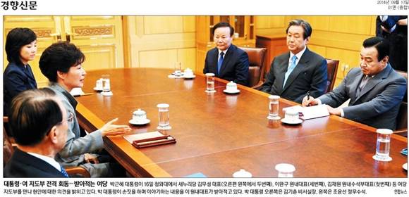 경향신문도 대통령과 여당 지도부가 전격 회동한 자리에서 박 대통령의 말을 받아적는 여당 지도부의 모습을 보도했다. 경향신문은 “박 대통령이 16일 청와대에서 새누리당 김무성 대표, 이완구 원내대표, 김재원 원내수석부대표 등 여당 지도부를 만나 현안에 대한 의견을 밝히고 있다”며 “박 대통령이 손짓을 하며 이야기하는 내용을 이 원내대표가 받아적고 있다”고 밝혔다. 박 대통령 곁에는 김기춘 비서실장(오른쪽)과 조윤선 정무수석(왼쪽)이 있다.