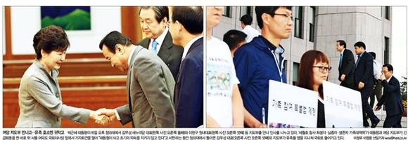 한겨레는 ‘여당 지도부 만나고…유족 호소엔 귀막고’라는 제목의 1면 사진에서 박 대통령과 여당 지도부 만남과 세월호 참사 가족대책위의 모습을 나란히 게재했다. 한겨레는 “박 대통령이 16일 오후 청와대에서 김무성 새누리당 대표와 이완구 원내대표 등 지도부를 만나 인사를 나누고 있다”며 “‘세월호 참사 희생자ㆍ실종자ㆍ생존자 가족대책위’가 대통령과 여당 지도부가 긴급회동을 한 바로 뒤 서울 여의도 국회의사당 앞에서 기자회견을 열어 ‘대통령이 사고 초기의 약속을 지키지 않고 있다’고 비판하는 동안 청와대에서 돌아온 김무성 대표와 지도부가 유족들 옆을 지나쳐 국회로 들어가고 있다”고 밝혔다.