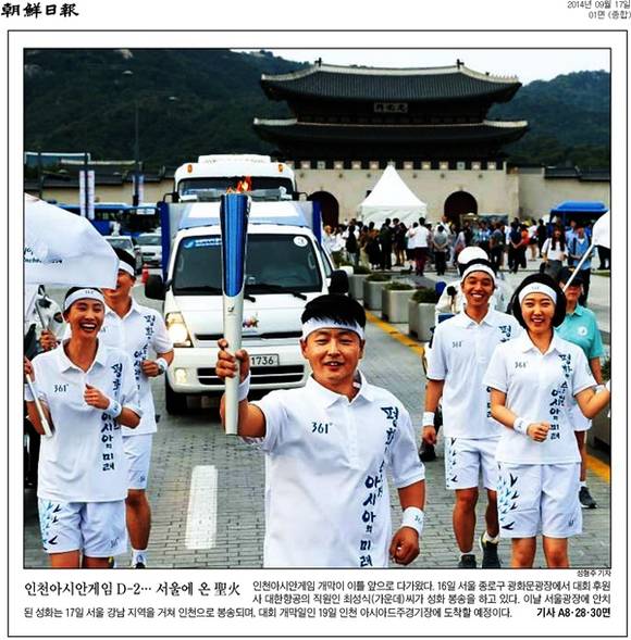 반면 조선일보와 동아일보는 17일 인천아시안게임 개막이 이틀 앞으로 다가온 가운데 16일 서울에 도착한 성화의 봉송 장면을 실었다. 조선일보는 “16일 서울 종로구 광화문광장에서 대회 후원사 대한항공의 직원인 최성식(사진 가운데)씨가 성화 봉송을 하고 있다”며 “이날 서울광장에 안치된 성화는 17일 서울 강남 지역을 거쳐 인천으로 봉송되며 대회 개막일인 19일 인천 아시아드주경기장에 도착할 예정”이라고 밝혔다. 동아일보도 “16일 신촌을 시작으로 광화문, 서울역 등을 차례로 찾은 성화는 17일 서울을 빠져나가 인천으로 향한다”며 “이번 성화 봉송에는 4000여명의 주자가 참여해 17개 시도와 70개 시군구 5700여 km를 돌며 대회를 알렸다”고 전했다.