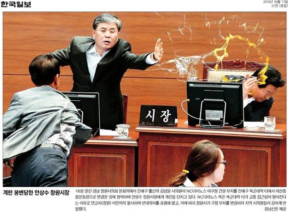 한국일보는 16일 열린 경남 창원시의회 본회의에서 계란 봉변을 당한 안상수 창원시장의 모습을 1면에 담았다. NC다이노스 야구장 건설 부지를 진해구 육군대학 터에서 마산종합운동장으로 변경한 것에 진해구 출신의 김성일 시의원이 항의하며 안 시장에 계란을 던지는 장면이다. 한국일보는 “NC다이노스 측은 육군대학 터가 교통 접근성이 떨어진다는 이유로 연고지(창원) 이전까지 불사하며 반대의사를 표명해왔다”며 “이에 따라 창원시가 구장 부지를 변경하자 지역 시의원들이 강하게 반발했다”고 밝혔다.