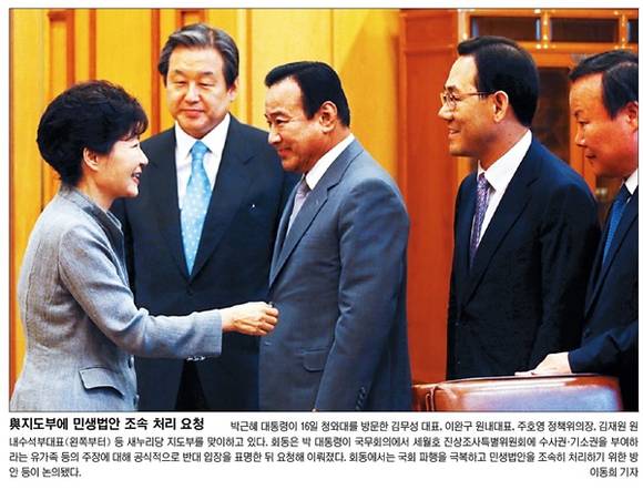 국민일보, 서울신문, 세계일보는 박 대통령이 청와대에서 새누리당 지도부를 맞이하는 모습을 실었다. 국민일보는 “회동은 박 대통령이 국무회의에서 세월호 진상조사특별위원회에 수사권ㆍ기소권을 부여하라는 유가족 등의 주장에 대해 공식적으로 반대 입장을 표명한 뒤 요청해 이뤄졌다”며 “회동에서는 국회 파행을 극복하고 민생법안을 조속히 처리하기 위한 방안 등이 논의됐다”고 전했다. 세계일보도 “박 대통령은 여당 지도부와 회동에서 세월호 진상조사특별위에 수사권 및 기소권이 부여될 경우 국기가 흔들릴 수 있다는 점을 지적하면서 조속한 민생법안 처리를 당부했다”고 밝혔다.