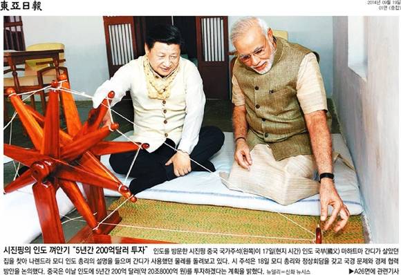 동아일보는 인도를 방문한 시진핑의 사진을 보도했다. 동아일보는 ‘시진핑의 인도 껴안기’라는 제목으로 “시진핑 중국 국가주석(왼쪽)이 17일(현지시간) 인도 국부(國父) 마하트마 간디가 살았던 집을 찾아 나렌드라 모디 인도 총리의 설명을 들으며 간디가 사용했던 물레를 돌려보고 있다”며 “시 주석은 18일 모디 총리와 정상회담을 갖고 국경 문제와 경제 협력 방안을 논의했다. 중국은 이날 인도에 5년간 200억 달러(약 20조8000억원)를 투자하겠다는 계획을 밝혔다”고 전했다.