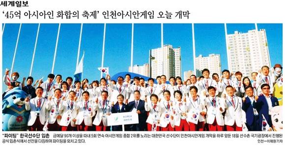 19일 조간신문들은 한국선수단과 북한선수단, 성화 봉송 주자의 1면 사진으로 ‘45억 아시아인의 축제’ 아시안게임의 개막 소식을 알렸다. 국민일보와 세계일보는 한국선수단의 입촌 사진을 게재했다. 국민일보는 “‘5회 연속 아시안게임 종합 2위 달성’ 목표를 내세운 대한민국 국가대표 선수단이 18일 인천 구월동 선수촌 내 국기광장에서 열린 입촌식에서 파이팅을 외치고 있다”고 밝혔다. 세계일보도 “금메달 90개 이상을 따내 5회 연속 아시안게임 종합 2위를 노리는 대한민국 선수단이 18일 공식 입촌식에서 선전을 다짐하며 파이팅을 외치고 있다”고 밝혔다.