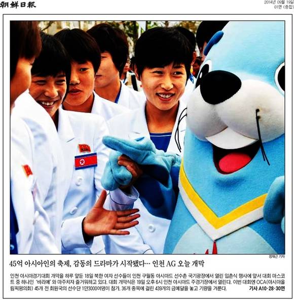 조선일보와 한국일보는 전날 열린 입촌식에서의 북한 선수단 모습을 보도했다. 조선일보는 ‘45억 아시아인의 축제, 감동의 드라마가 시작됐다’는 제목으로 “개막을 하루 앞둔 18일 북한 여자 선수들이 인천 구월동 아시아드 선수촌 국기광장에서 열린 입촌식 행사에 앞서 대회 마스코트 중 하나인 ‘바라메’와 마주치자 즐거워하고 있다”며 “이번 대회엔 OCA(아시아올림픽평의회) 45개 전 회원국의 선수단 1만3000여명이 참가, 36개 조목에 걸린 439개의 금메달을 놓고 기량을 겨룬다”고 밝혔다. 한국일보도 “김병식 체육성 부상이 단장을 맡은 북한 선수단이 18일 열린 입촌식에서 인공기가 게양되는 것을 바라보고 있다”며 “축구와 양궁, 체조, 탁구, 역도 등 14개 종목에 선수 150명을 파견한 북한은 2002년 부산 대회(9위) 이후 12년 만에 톱10 복귀를 노린다”고 전했다.