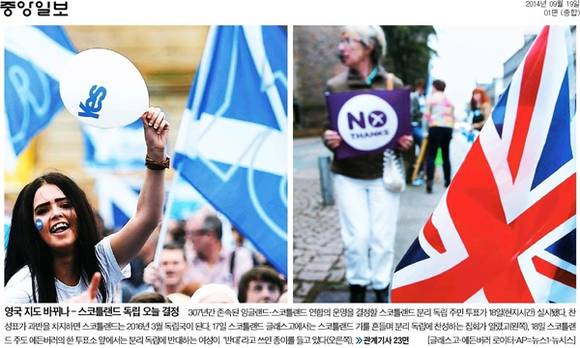 중앙일보와 경향신문은 19일 진행되는 스코틀랜드 독립 투표로 영국 지도의 미래가 달렸다고 전했다. 중앙일보는 “307년간 존속된 잉글랜드ㆍ스코틀랜드 연합의 운명을 결정할 스코틀랜드 분리 독립 주민 투표가 18일(현지시간) 실시됐다”며 “찬성표가 과반을 차지하면 스코틀랜드는 2016년 3월 독립국이 된다”고 밝혔다. 이어 “17일 스코틀랜드 글래스고에서는 스코틀랜드 기를 흔들며 분리 독립에 찬성하는 집회가 열렸고(사진 왼쪽), 18일 스코틀랜드 주도 에든버러의 한 투표소 앞에서는 분리 독립에 반대하는 여성이 ‘반대’라고 쓰인 종이를 들고 있다”고 밝혔다. 경향신문도 스코틀랜드 분리독립 주민투표가 실시된 18일, 에든버러 인근 도시 포르토벨로의 한 투표소에서 유권자들이 줄지어 투표 시작을 기다리고 있는 사진을 실었다.