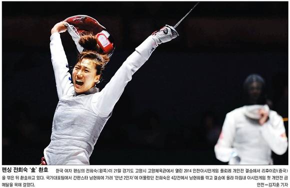 국민일보는 대회 사흘째인 21일 여자 펜싱 플뢰레 개인전 결승에서 중국 선수 리후이린을 꺾고 환호하고 있는 전희숙 선수의 모습을 1면에 담았다. 국민은 “국가대표팀에서 간판스타 남현희에 가려 ‘만년 2인자’에 머물렀던 전희숙은 4강전에서 남현희를 꺾고 결승에 올라 마침내 아시안게임 첫 개인전 금메달을 목에 걸었다”고 전했다.