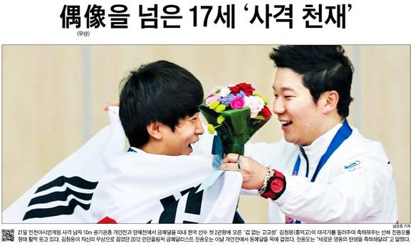 가장 스포트라이트를 받은 주인공은 남자 10m 공기권총 개인전과 단체전에서 한국 선수 첫 2관왕에 오른 ‘겁 없는 고교생’ 김청용이었다. 세계 1인자 진종오 선수를 꺾고 금메달을 따낸 ‘사격천재’의 활약에 전 국민의 관심이 집중됐다.