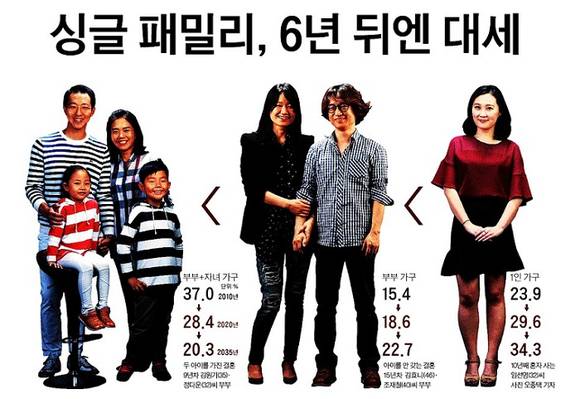 한편 중앙일보는 ‘싱글 패밀리, 6년 뒤엔 대세’라는 제목의 1면 머리기사에서 변화하는 가족의 형태를 사진으로 나타냈다. 중앙은 “2014년 대한민국에선 ‘가족 빅뱅’이 일어나고 있다. ‘부부+자녀’로 구성된 전통적 가족이 줄고 ‘1인 가구’가 주요 가족 형태로 자리 잡고 있다”고 보도했다. 통계청 전망에 의하면 6년 후인 2020년엔 1인 가구가 전체의 29.6%를 차지해 가장 보편적인 가구 형태가 되고 2050년에는 전체의 37%까지 치솟을 것이란 예측이다. 자녀 없는 부부 가구도 늘어나 2013년 부부 가구(22.1%)가 부부+자녀 가구(22%)를 처음으로 추월해 두 번째로 많은 가구 형태라고 통계청은 분석했다.