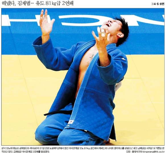 남자 유도 81kg급 결승에서 금메달을 따며 대회 2연패에 성공한 김재범은 서울신문, 한국일보, 한겨레 등의 1면을 장식했다. 한국은 ‘해냈다, 김재범…유도 81kg급 2연패’라는 제목으로 “한국 유도의 대들보 김재범이 21일 인천 도원체육관에서 열린 아시안게임 유도 81kg 결승에서 레바논의 나시프 엘리아스를 판정으로 꺾고 금메달을 차지한 뒤 기쁨을 만끽하고 있다”고 전했다. 한겨레는 8강전에서 북한 박홍위를 가로누르기 한판승으로 이긴 뒤 손을 내밀어 일으켜 주고 있는 ‘훈훈한’ 장면을 담았다.