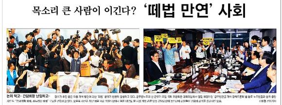 국민일보는 공무원 연금 토론회 무산 현장과 함께 지난 18일 국회 의원식당에서 열린 내년도 쌀 시장 개방 관련 당정 간담회가 농민들에 의해 중단된 모습을 나란히 배치한 뒤 ‘목소리 큰 사람이 이긴다? ‘떼법 만연’ 사회’라는 머리기사 제목을 달았다. 국민일보는 “정치가 제 역할을 못하면서 ‘떼법(떼로 몰려다니며 자신들만의 이익을 위해 법질서를 위반하는 행위)’이 기승을 부리고 있다”며 “세월호 정국의 해법을 찾지 못해 의회민주주의가 위기를 맞은 상황에서 떼법으로 법치주의까지 흔들리고 있는 형국”이라고 보도했다.