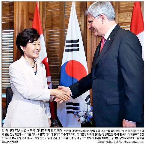 서울신문과 조선일보는 캐나다를 국민 방문 중인 박근혜 대통령과 스티븐 하퍼 캐나다 총리가 정상회담을 앞두고 악수를 나누는 사진을 1면에 실었다. 서울신문은 “박 대통령과 하퍼 총리는 정상회담을 통해 한·캐나다 자유무역협정(FTA)에 정식 서명했고 에너지·자원 관련 기술과 북극 연구·개발, 산림 분야 등으로 협력의 범위를 확대하는 등 각종 양해각서(MOU)를 체결했다”고 설명했다.