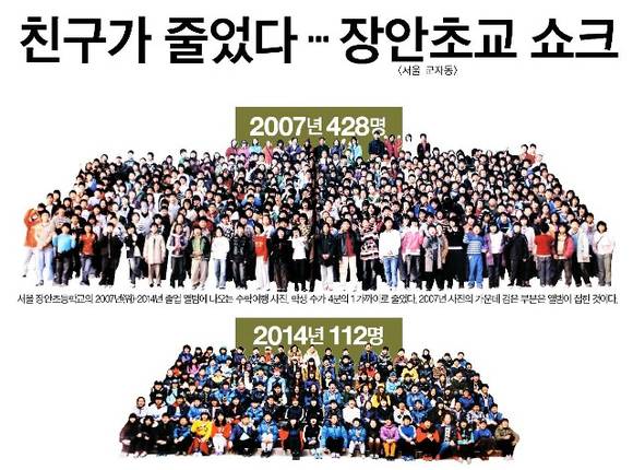 중앙일보는 전날에 이어 23일에도 ‘2014 가족 빅뱅…새로운 가족이 온다’ 기획 시리즈를 1면에 내세웠다. 서울 장안초등학교의 2007년, 2014년 졸업앨범에 나오는 수학여행 단체 사진을 비교해 학생 수가 학생 수가 4분의1 가까이로 줄어든 모습을 한 눈에 보여줬다. 중앙에 따르면 2007년 428명이었던 이 학교의 졸업생 수는 2010년 238명, 올해는 112명으로 급감했다. 중앙은 “초(初)저출산 시대에 돌입하면서 전국 초등학생 수가 급감하는 등 사회 곳곳에서 크고 작은 균열이 일고 있다”고 전했다.
