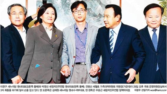 동아일보, 서울신문, 세계일보, 중앙일보, 한겨레 등은 지난 29일 국회 운영위원장실에서 새누리당 이완구 원내대표, 새정치민주연합 박영선 원내대표, 전명선 세월호 가족대책위 위원장이 세월호 특별법 논의를 위한 3자 회동에 앞서 기념 촬영한 모습을 1면 사진으로 게재했다.