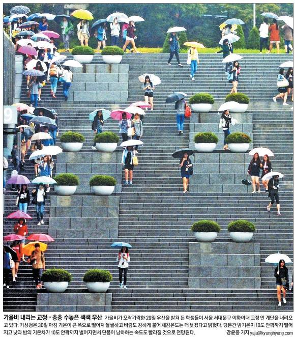 경향신문은 이날 '가을비 내리는 교정'이란 1면 사진을 통해 우리 앞으로 성큼 다가온 가을 소식을 전했다.