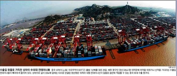 조선일보는 '수출입 화물로 가득찬 상하이 中 최대 컨테이너 港'이란 1면 사진을 통해 중국 상하이 자유무역지대 출범 1년째를 맞아 양산항 야적장에 수출입 컨테이너들이 가득 차 있는 사진을 실었다.