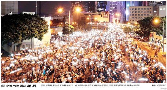 한국일보는 '홍콩시위대 수만명 경찰과 밤샘 대치'란 1면 사진 기사를 통해 경찰과 밤샘 대치 중인 수만명의 홍콩 시위대를 소식을 전했다. 홍콩 시민들은 중국 중앙정부가 2017년부터 홍콩 행정장관 직선제 후보 제한 발표에 반발해 지난 28일부터 민주화 시위를 펼치고 있다.