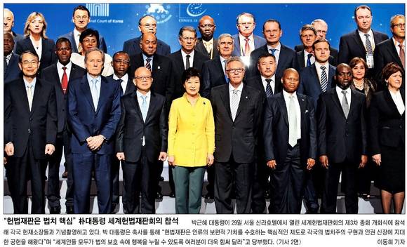 국민일보는 지난 29일 서울 중구 장충동 신라호텔에서 열린 세계헌법재판회의 제3차 총회 개회식에 참석한 박근혜 대통령과 각국 헌재소장들의 기념촬영 장면을 1면 사진으로 보도했다.