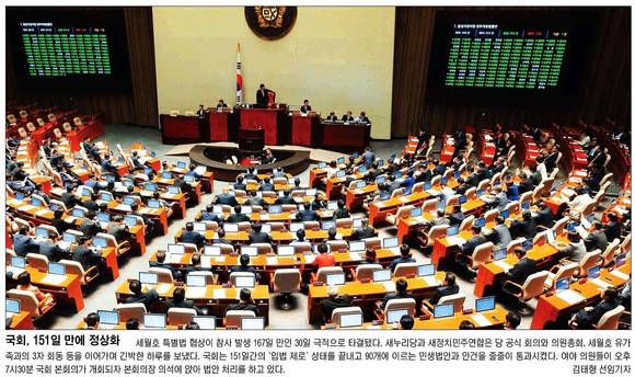 국민일보, 세계일보는 이날 여야 간 세월호 특별법 협상이 참사 발생 167일 만인 지난달 30일 극적으로 타결되면서 국회가 151일 만에 정상화된다는 소식을 1면 사진 기사로 전했다.