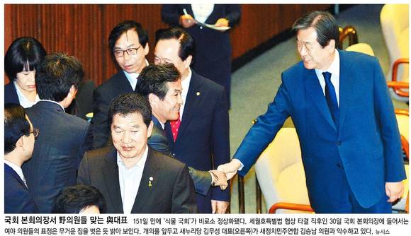 동아일보, 중앙일보는 151일 만에 '식물 국회'가 정상화됐다며 개의를 앞두고 새누리당 김무성 대표가 새정치민주연합 의원들과 악수하는 장면을 1면 사진으로 처리했다.