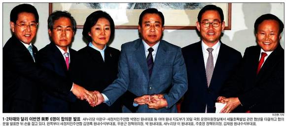 서울신문, 조선일보도 여야가 세월호특별법 협상을 타결, 30일 여야 원내 지도부가 합의안을 발표한 후 손을 맞잡고 함께 기념사진을 찍는 장면을 담았다.