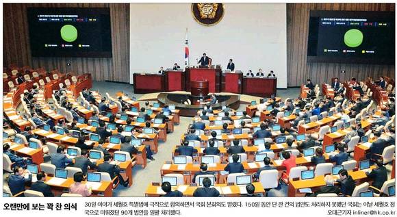한국일보는 '오래 만에 보는 꽉 찬 의석'이란 1면 사진 기사에서 30일 여야가 세월호 특별법에 극적으로 합의하면서 국회 본회의가 열린 소식을 전했다.