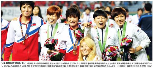 경향신문은 이날 '남북 여자축구 '우리는 하나''란 1면 사진 기사를 통해 지난 1일 인천 문학경기장에서 열린 인천아시안게임 여자 축구 경기에서 각각 금메달과 동메달을 획득한 북한과 남한 선수들이 함께 기념 촬영하는 모습을 게재했다.