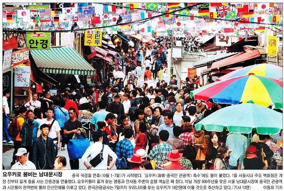 국민일보는 중국 국경절 연휴(10월1~7일)을 맞아 요우커(중국인 관광객)로 붐비는 남대문 시장 모습을 1면 사진으로 담았다.