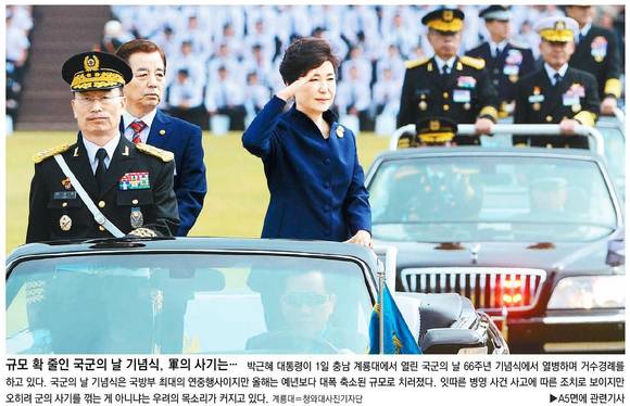 동아일보는 '규모 확 줄인 국군의 날 기념식, 군의 사기는…'란 1면 사진 기사를 통해 박근혜 대통령이 1일 충남 계룡대에서 열린 국군의 날 66주년 기념식에 참석한 모습을 보도했다.
