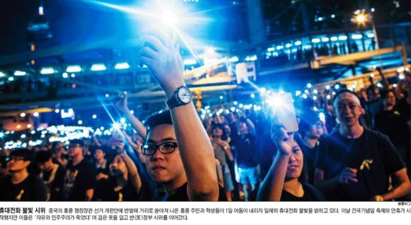 조선일보도 이날 '휴대전화 불빛 시위'란 1면 사진을 통해 중국의 홍콩 행정장관 선거 개편안에 반발해 거리로 쏟아져 나온 홍콩 시민들의 시위 장면을 담았다.
