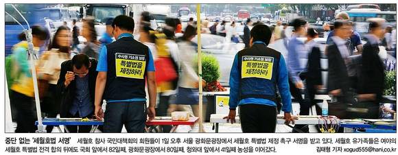 한겨레는 '중단없는 '세월호법 서명''란 1면 사진 기사를 통해 세월호 참사 국민대책위원회 회원들이 1일 오후 서울 광화문광장에서 세월호 특별법 제정 촉구 서명을 받고 있는 장면을 실었다.