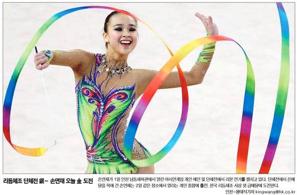 한국일보는 손연재 선수가 1일 인천 남동체육관에서 열린 아시안게임 개인 예선 및 단체전에서 리본 연기를 펼치고 있는 모습을 1면 사진 기사로 전했다.