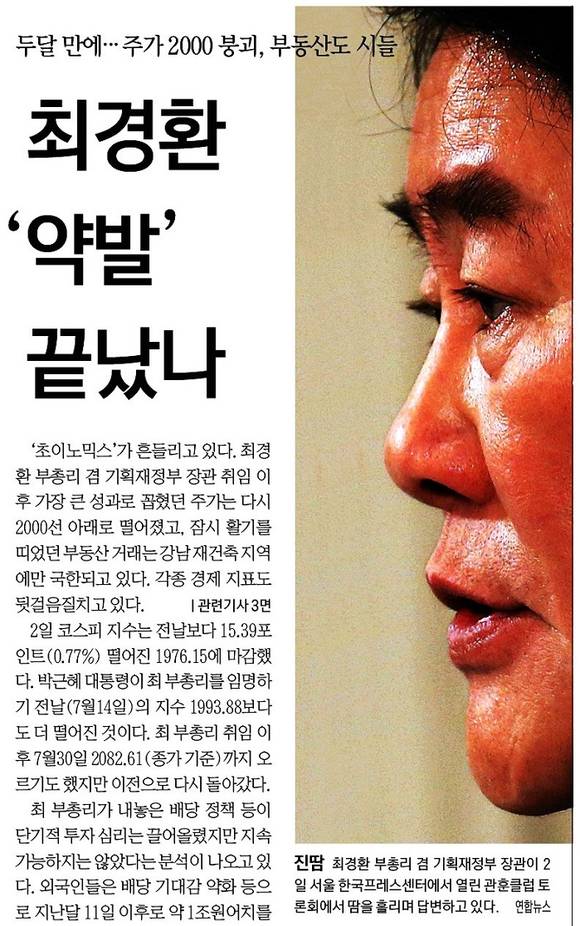 경향신문은 환호하는 한국 축구팀과 아쉬워하는 북한 축구팀 선수들의 엇갈린 표정을 실었다. 그 옆으로 ‘최경환 ‘약발’ 끝났나’라는 1면 머리기사와 함께 최경환 부총리 겸 기획재정부 장관이 2일 관훈클럽 토론회에서 땀을 흘리며 답변하는 모습을 ‘진땀’이라는 제목으로 보도한 것도 눈길을 끌었다.