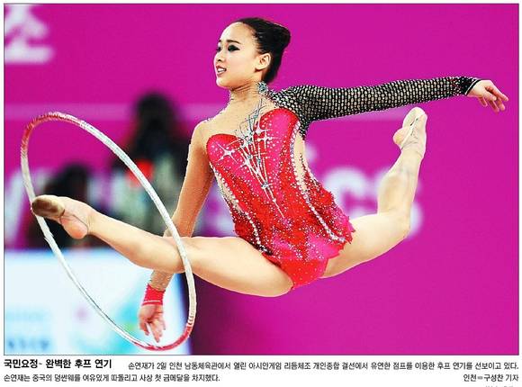 국민일보는 ‘리듬체조 요정’ 손연재의 완벽한 후프 연기 장면을 선택했다. 손연재는 2일 인천 남동체육관에서 열린 아시안게임 리듬체조 개인종합 결선에서 중국의 덩썬웨를 여유 있게 따돌리고 사상 첫 금메달을 차지했다.