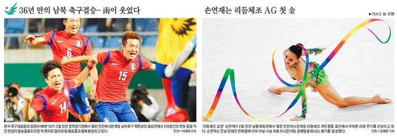 세계일보도 남자 축구팀의 승리의 순간과 함께 손연재 선수가 리듬체조 개인종합 결선에서 우아한 리본 연기를 선보이고 있는 장면을 나란히 1면에 실었다.