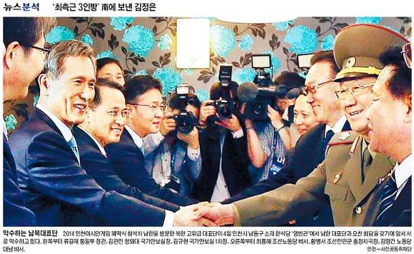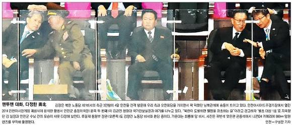 동아일보는 “2014 인천 아시아경기대회 폐막식 참석을 명분으로 방문한 북한 고위급 대표단이 4일 인천의 한 식당에서 한국 측 인사들과 악수하고 있다”며 “남북관계 개선의 중요한 계기가 마련될지 주목된다”고 밝혔다.