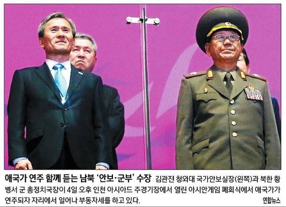 경향신문은 ‘애국가 연주 함께 듣는 남북 안보·군부 수장’이라는 제목의 사진을 통해 아시안게임 폐회식에서 애국가가 연주되자 자리에서 일어나 부동자세를 하고 있는 김관진 실장과 황병서 국장의 모습을 전했다.