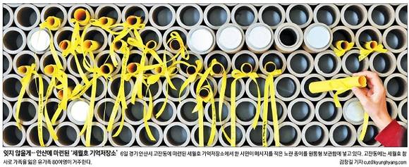 경향신문은 ‘잊지 않을게…안산에 마련된 세월호 기억저장소’라는 제목의 사진을 통해 경기 안산시 고잔동에 마련된 세월호 기억저장소의 모습을 담았다. 경향신문은 “한 시민이 메시지를 적은 노란 종이를 원통형 보관함에 넣고 있다”며 “고잔동에는 세월호 참사로 가족을 잃은 유가족 80여명이 거주한다”고 보도했다.