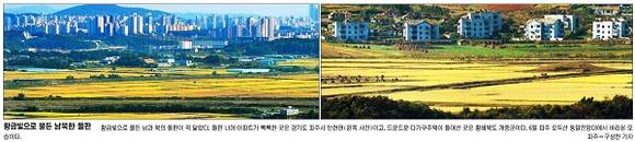 한로(寒露)가 하루 앞으로 다가왔다. 오곡백과를 수확하기 위해 타작이 한창인 때이다. 국민일보는 ‘황금빛으로 물든 남북한 들판’이라는 제목의 사진을 통해 수확 시기가 다가온 황금들녘의 모습을 전했다. 국민일보는 “황금빛으로 물든 남과 북의 들판이 꼭 닮았다”며 “들판 너머 아파트가 빽빽한 곳은 경기도 파주시 탄현면이고, 드문드문 다가구주택이 들어선 곳은 황해북도 개풍군”이라고 보도했다.