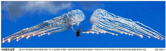 전날 오후 경기 양평군 비승사격장에서 ‘2014 육군항공 사격대회’가 열려 관련 사진을 보도한 일간지도 있었다. 한국일보는 시범사격에 참가한 한국형 첫 기동헬기 ‘수리온(KUH-1)’의 모습을 전하며 “수리온이 적의 열 추적 공격을 회피하기 위해 화염을 발사하는 모습이 꼭 날개같다”고 전했다.
