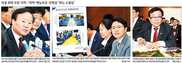 동아일보는 텅 빈 환경부 국감장의 모습을 1면 사진으로 실으며 “여야는 이날 오전 내내 야당 측이 요구한 정몽구 현대자동차그룹 회장, 김준호 SK하이닉스 사장, 이재용 삼성전자 부회장의 증인채택 문제를 놓고 공방을 벌였지만 접점을 찾지 못해 파행이 이어졌다”고 전했다.